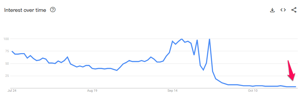 Søgeinteressen for nøgleordet “Hamster Kombat” faldt kraftigt fra en top på 100 point i september til kun 3 point i oktober. Dette fald fulgte efter fællesskabets utilfredshed med airdrop-kampagnen.