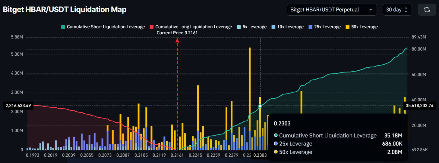 Afviklingskortet viser, at mere end $35 millioner i short-positioner kan blive afviklet, hvis HBAR stiger til $0,230. En sådan udvikling ville skabe en storstilet short squeeze, der potentielt kan drive yderligere bullish momentum på markedet. Dette ville give en mulighed for HBAR til at forlænge sit opsving.