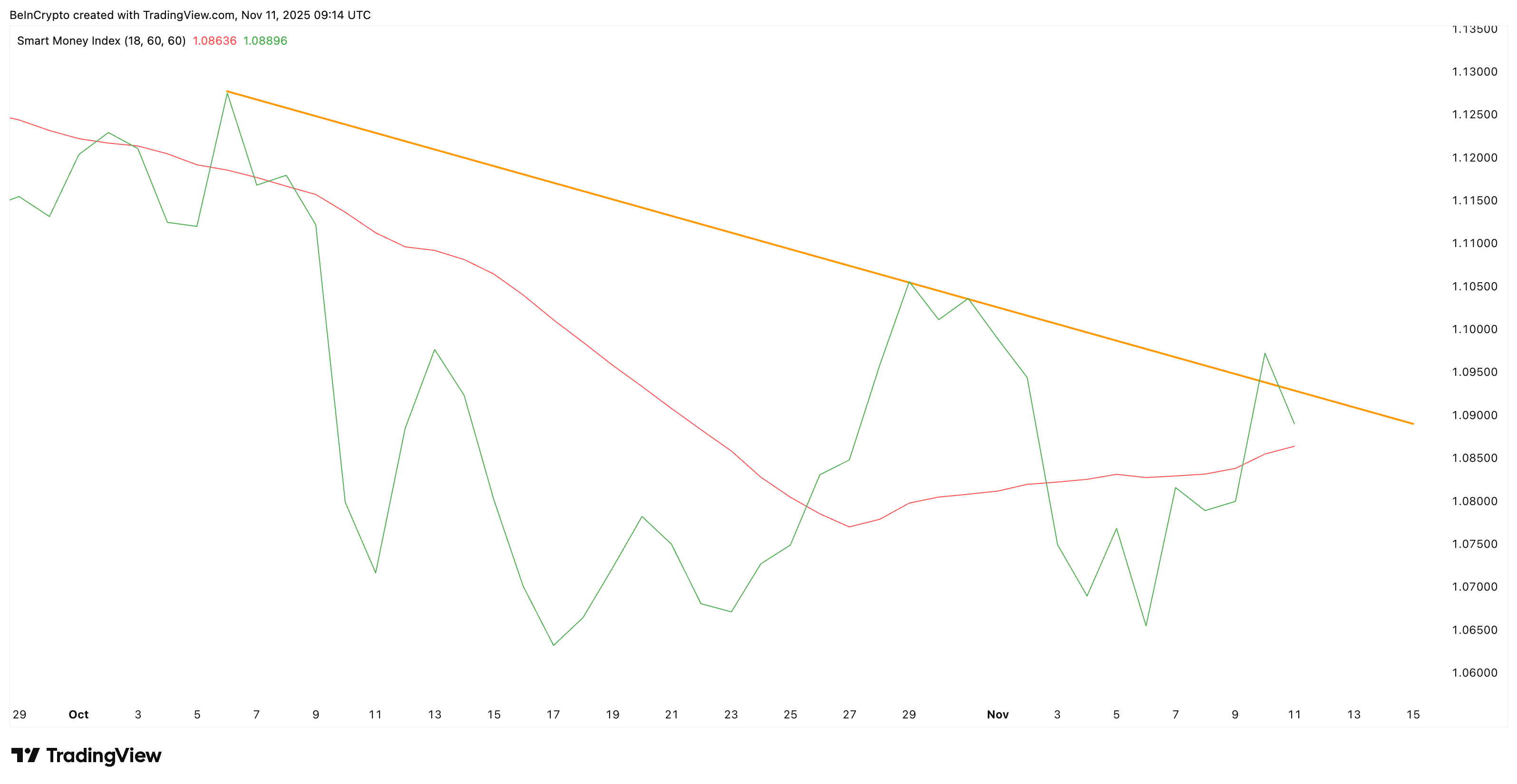 Smart Money Index (SMI) — som følger tidlig investeringsadfærd — understøtter også den opfattelse. SMI’s grønne linje ligger stadig let over signallinjen, hvilket betyder, at aktiviteten og pengestrømmen ikke er forsvundet. SMI formåede endda at bryde sin faldende trendlinje den 10. november. Det lykkedes dog ikke at udløse en stærk HBAR kursstigning.