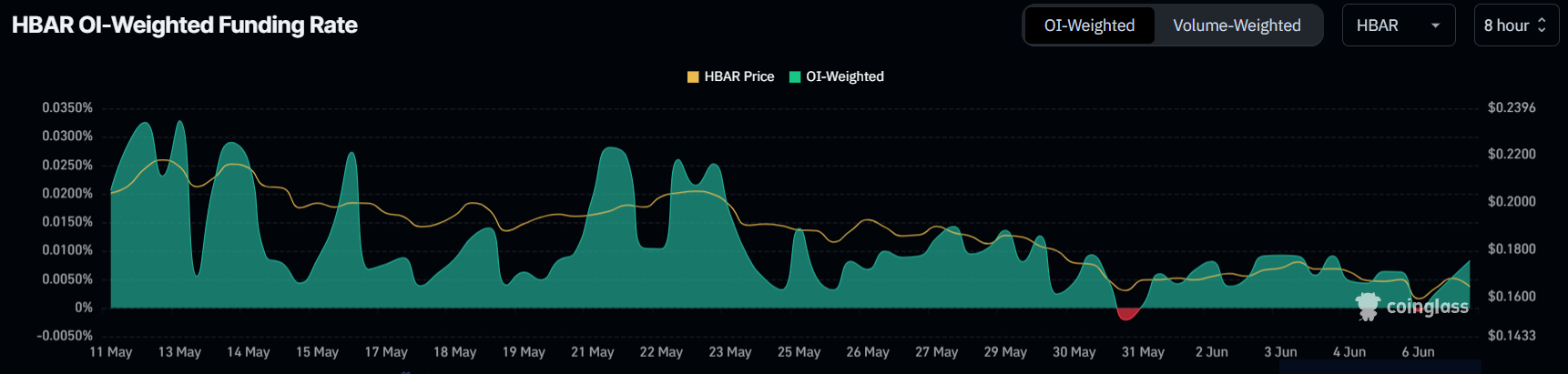 I de sidste 10 dage har HBAR’s finansieringsrate oplevet to skift fra positiv til negativ, den første forekomst i en måned. Denne ændring i stemning signalerer, at handlende justerer deres positioner og foretrækker korte positioner frem for lange.