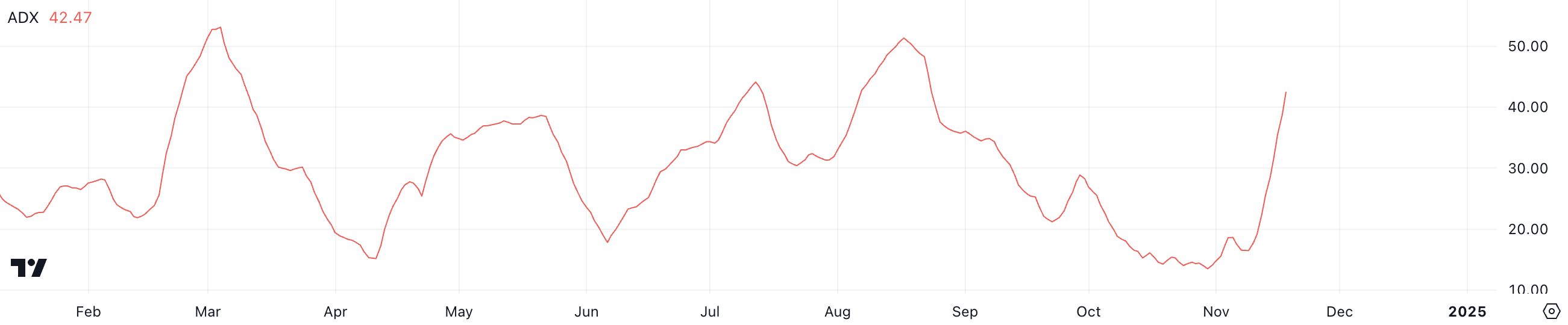 En så høj ADX-værdi afspejler betydelig momentum bag kursbevægelsen, hvilket antyder, at den nuværende opadgående tendens sandsynligvis vil fortsætte på kort sigt.