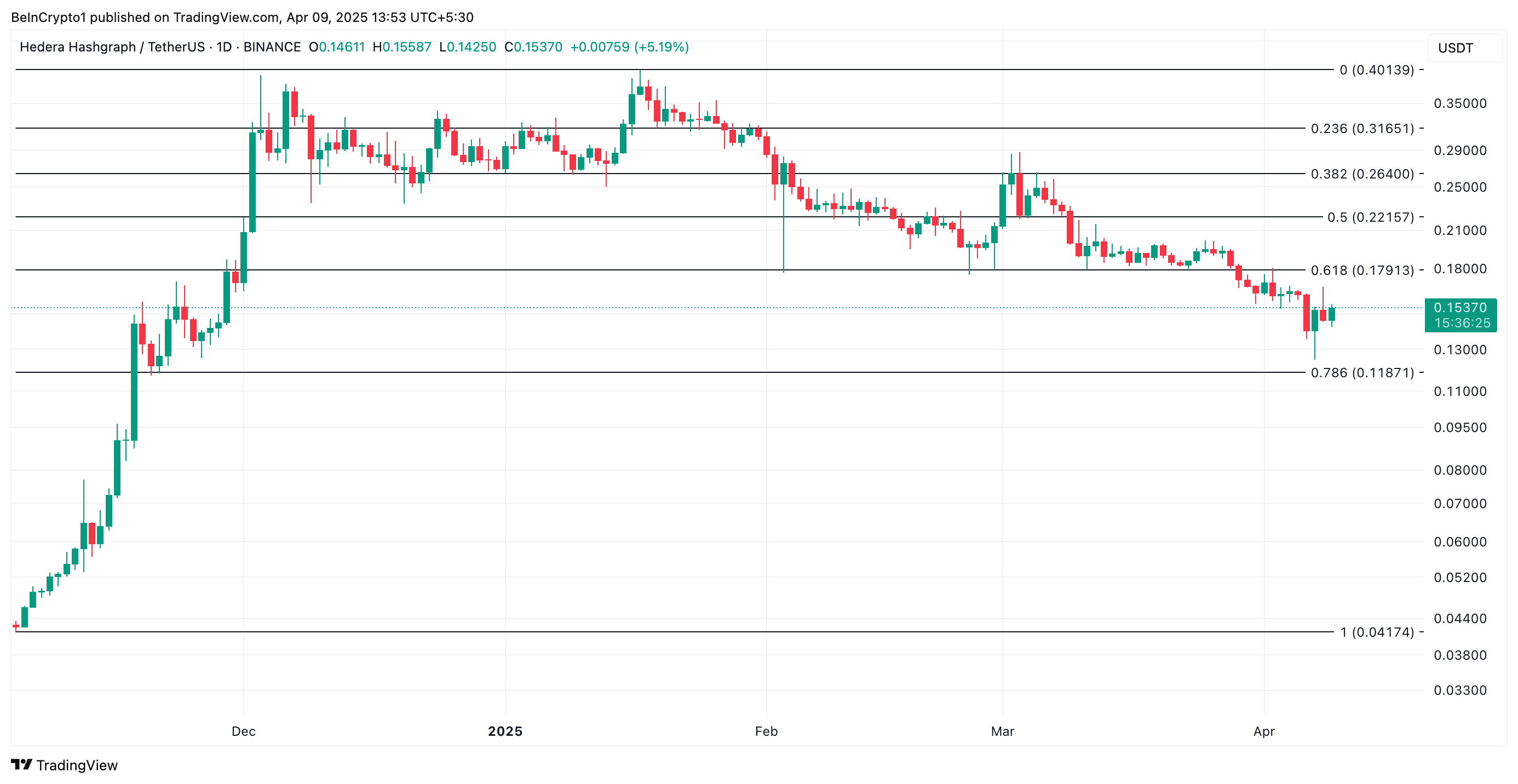 Men hvis profittagning fortsætter og bullish pres igen bliver afdæmpet, kan HBAR begrænse sit fald og falde til $0,11.