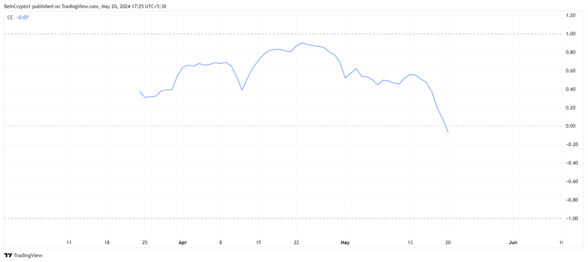 I løbet af weekenden steg Bitcoins pris og resten af markedet således, mens WIF-prisen faldt. Dette cementerede den negative korrelation, og indtil dette ændrer sig, kan den Solana-baserede meme-mønt fortsætte med at opleve modsatte resultater af Bitcoin.
