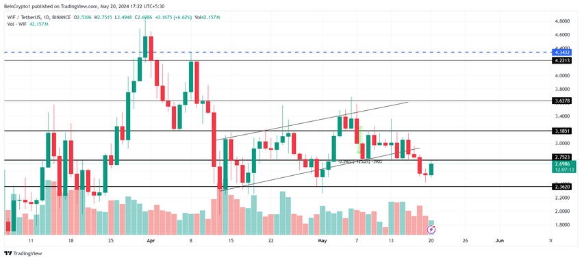 Weekendens dyk skubbede WIF-prisen længere ned under $ 2,50, hvorfra den er kommet sig lidt for at handle til $ 2,69 i skrivende stund. Hvis kryptoaktivet ikke bryder modstanden markeret til 2,75 $, falder det tilbage mod 2,36 $.