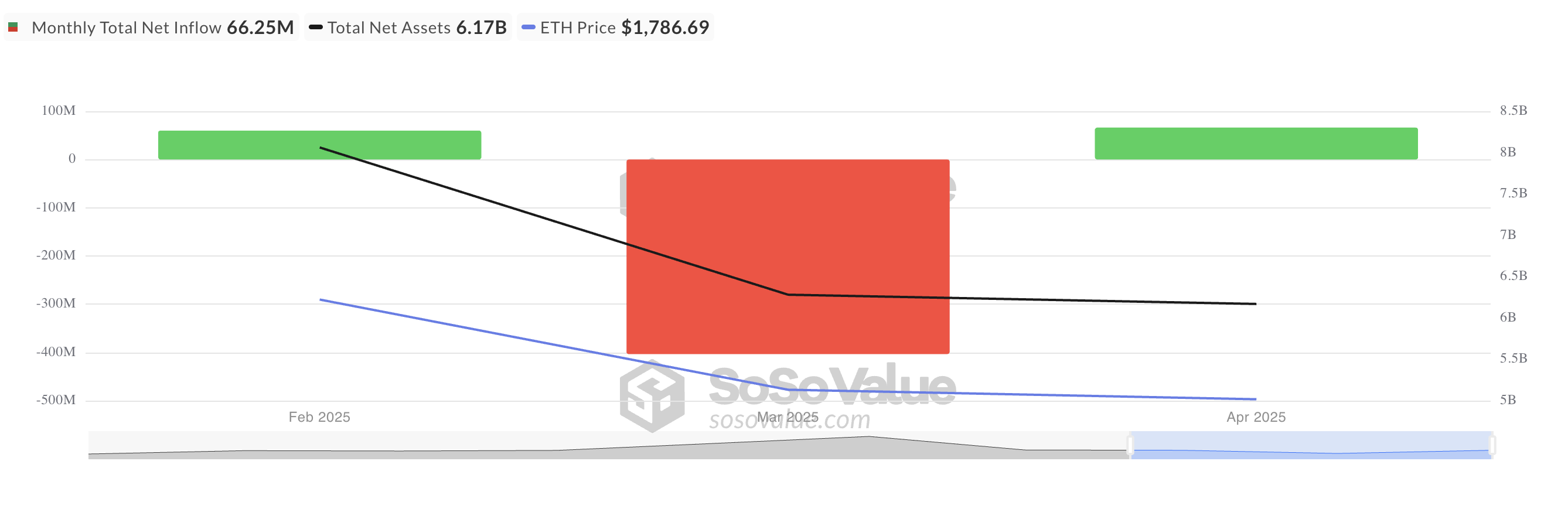 Ifølge SosoValue udgjorde de månedlige nettoindstrømninger i ETH ETF’er $66,25 millioner i april, hvilket signalerer en ændring i markedsstemningen sammenlignet med de $403,37 millioner i netto udstrømninger, der blev registreret i marts.