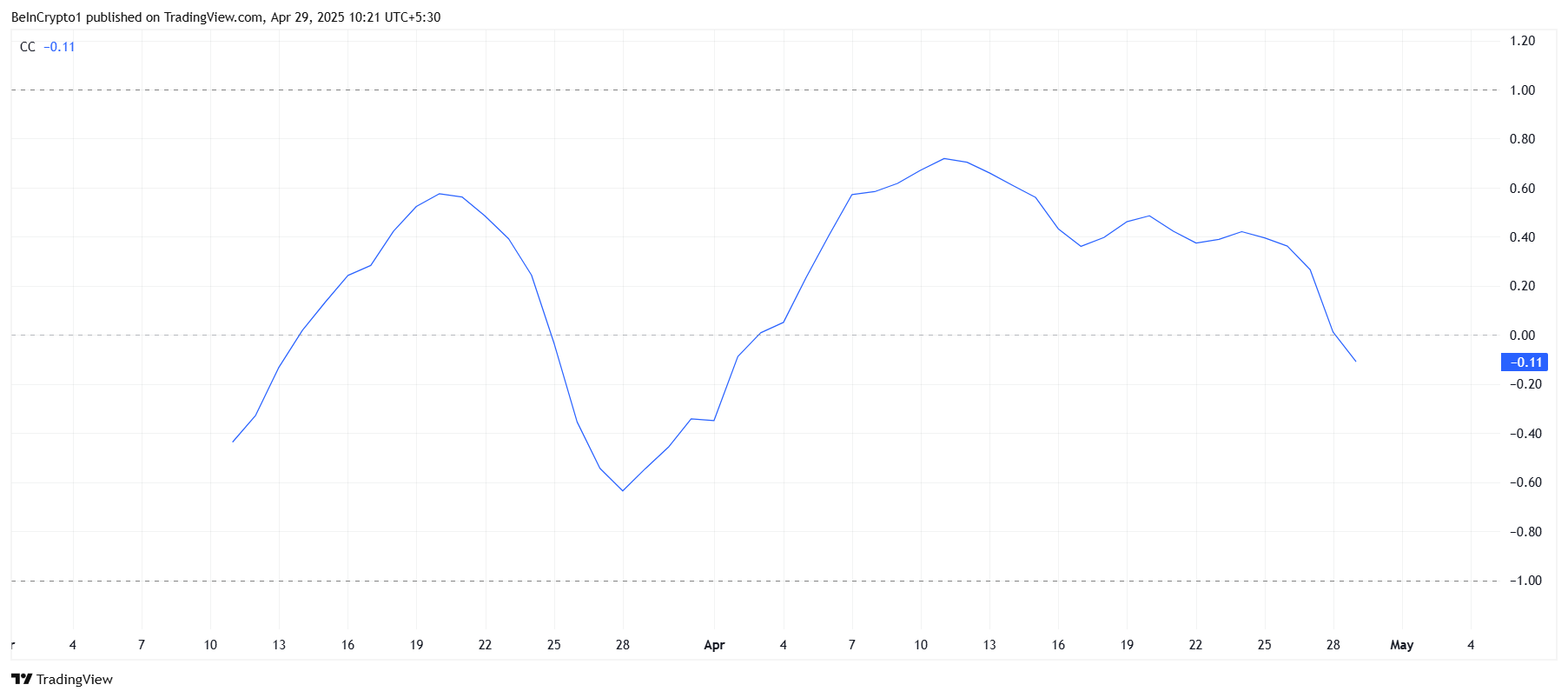 Pi Networks korrelation med Bitcoin er også et bekymringspunkt. I øjeblikket deler Pi en korrelation på -0,11 med Bitcoin, hvilket indikerer et omvendt forhold. Det betyder, at når Bitcoin oplever opadgående momentum, har Pi en tendens til at falde.