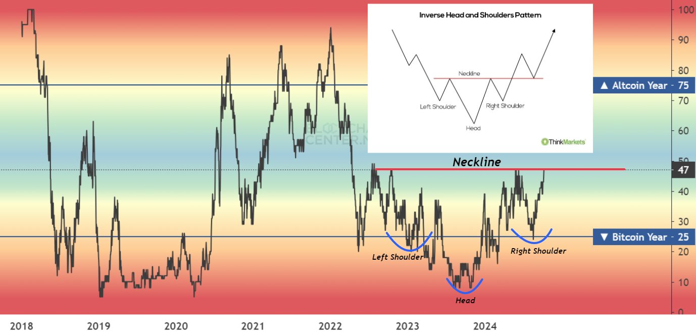 I et opslag den 11. oktober på X bemærkede den pseudonyme analytiker Moustache, at Altcoin Season Index har dannet et af de mest bullish mønstre i over 3,5 år: det omvendte hoved-og-skuldre.