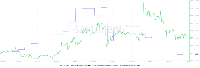 Traditionelt korrelerer et robust udviklingsøkosystem stærkt med prisen på en kryptovaluta. Det gælder også for XRP. Den 13. marts nåede XRP’s udviklingsaktivitet sit højeste niveau siden november 2023 med en værdi på 13,18. Denne stigning i aktivitet kunne tolkes som en stigning i investorernes interesse og tillid til projektets fremtid.