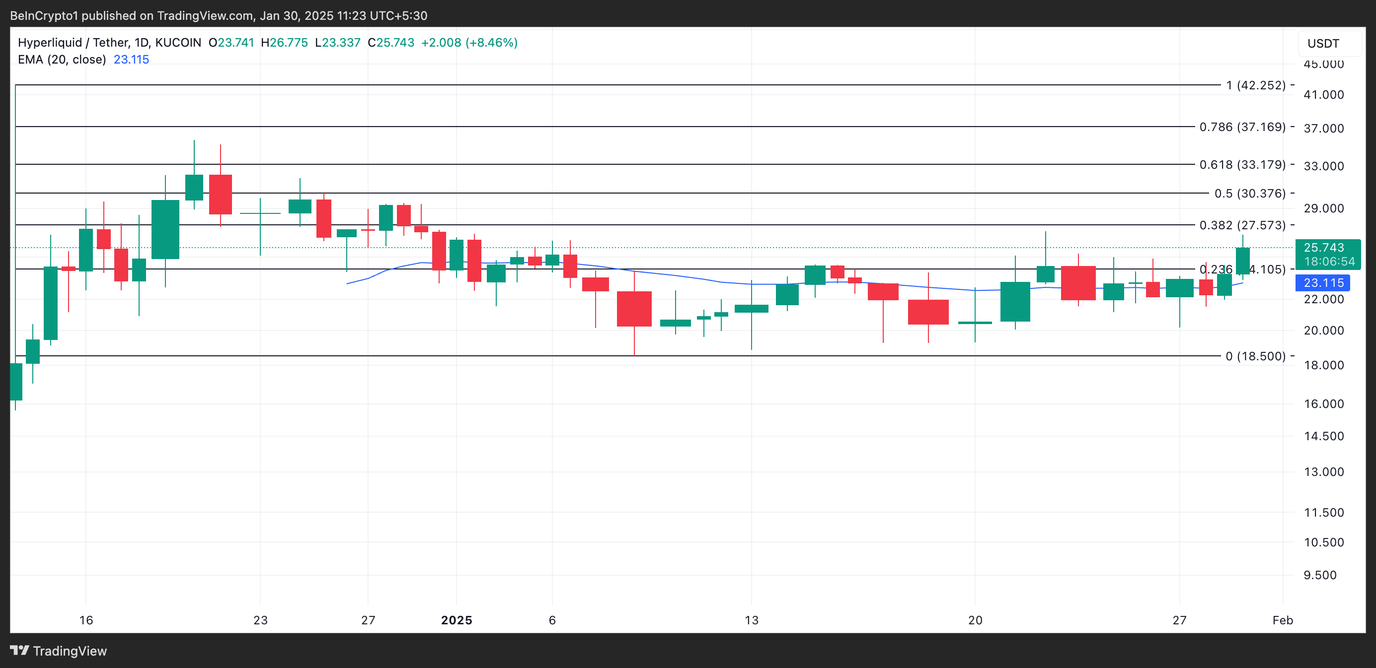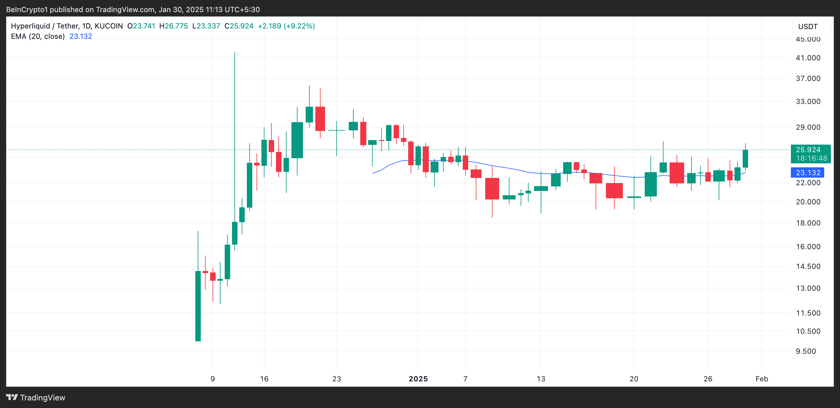 En vurdering af HYPE/USD en-dags diagrammet afslører, at HYPE nu handler over sin 20-dages EMA. Denne vigtige glidende gennemsnit måler et aktivs gennemsnitskurs over de sidste 20 dage og giver mere vægt til nylige kurser for at afspejle aktuelle tendenser.