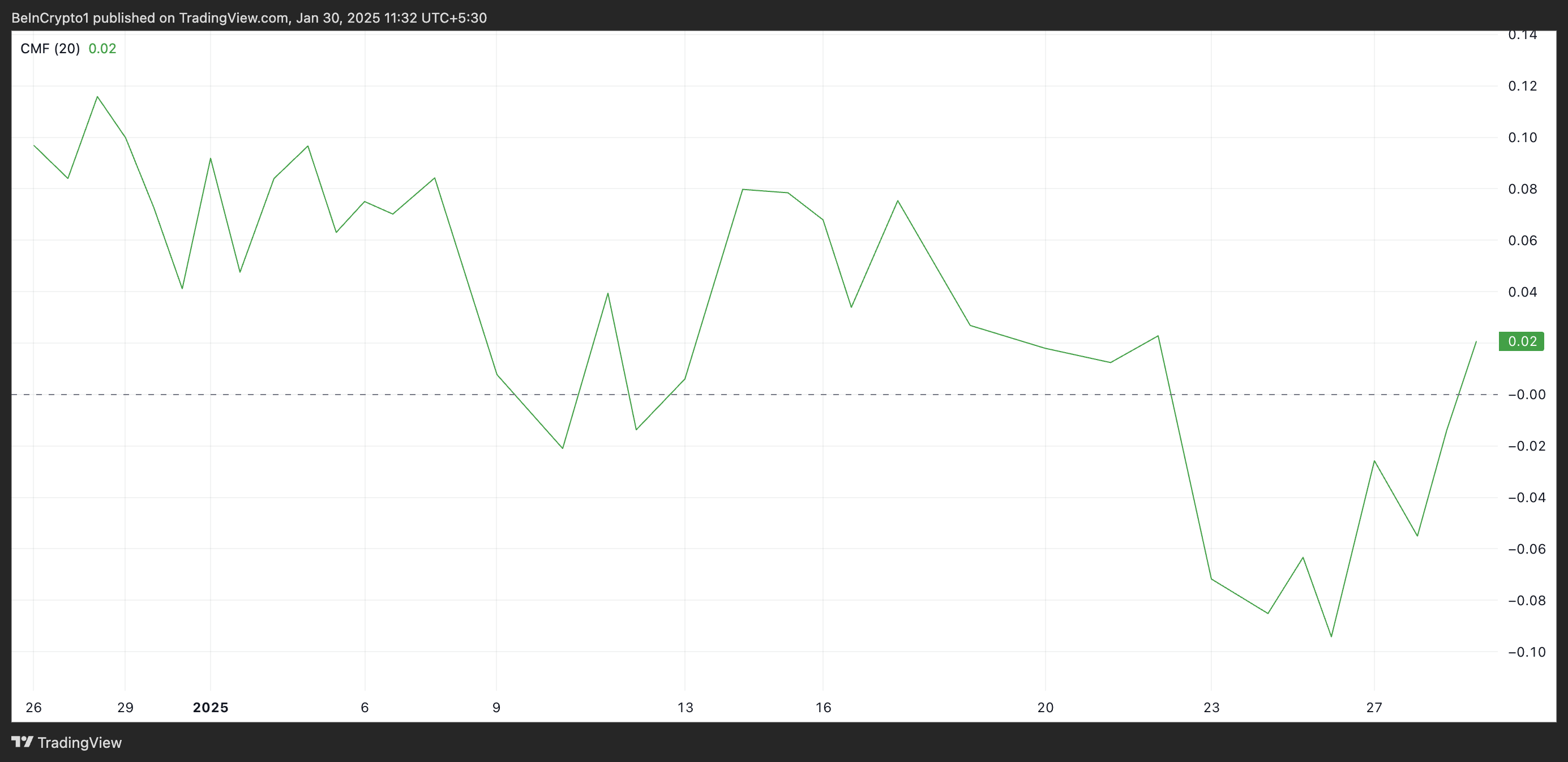 En aktivs CMF-indikator måler pengestrømmen ind og ud af dets marked. En CMF-værdi over nul indikerer stærkt købspres. Det antyder, at kapital strømmer ind i aktivet, og akkumulering opvejer distribution.
