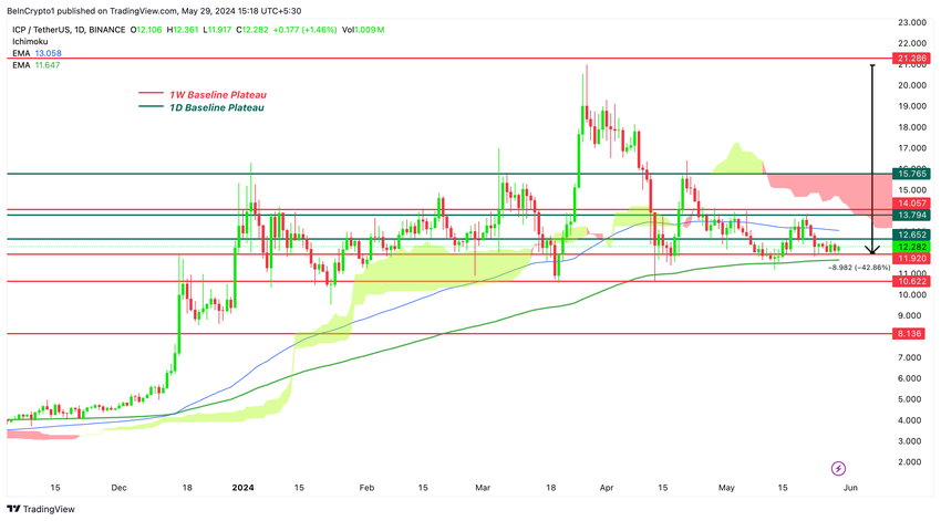 ICP-prisen svinger mellem $ 12,1 og $ 14, et afgørende interval, der er kendetegnet ved to betydelige 1-dages baseline-platåer.