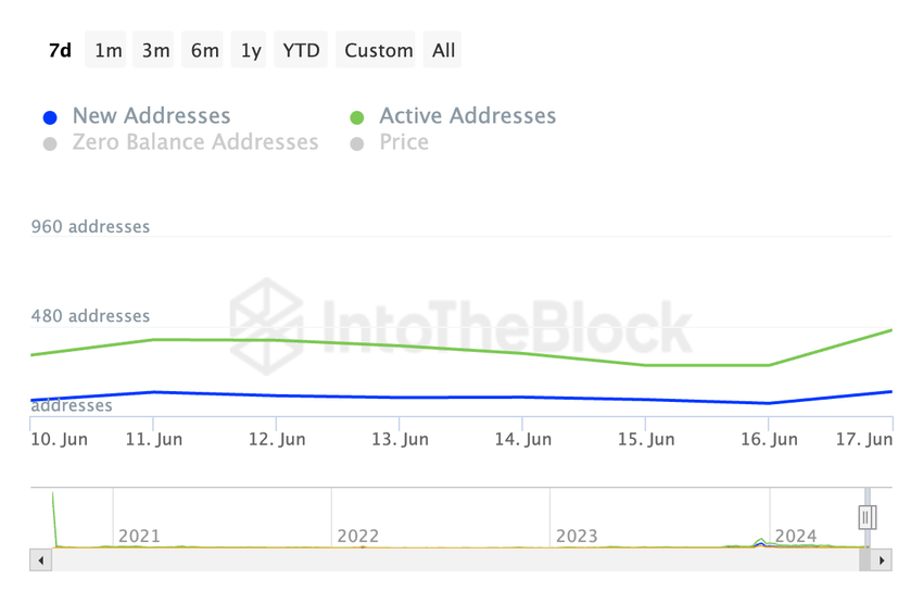 Altcoinen har registreret en stigning i ny efterspørgsel i samme periode. Antallet af nye adresser, der er oprettet på dets netværk for at handle tokenet, er også vokset med 57% i den sidste uge.