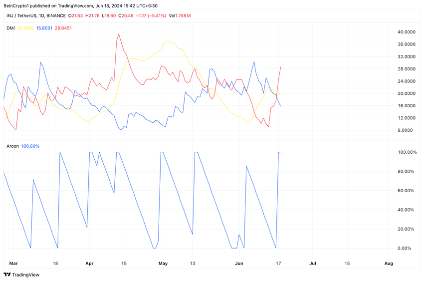INJ’s Aroon Down Line på 100% bekræfter styrken af den nuværende nedadgående tendens. Et aktivs Aroon-indikator måler dets trendstyrke og potentielle prisvendepunkter.