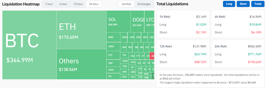 Denne udvikling resulterede i betydelige tab for tradere. Data fra Coinglass afslører, at ca. 962,40 millioner dollars gik tabt, hovedsageligt af bullish positionsindehavere, som led tab på 771,76 millioner dollars. Til sammenligning led shorttradere tab på 199,63 millioner dollars på grund af markedsnedgangen.