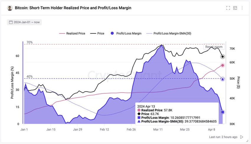 “Efter dagens udsalg er de handlendes urealiserede overskud (lilla område) det laveste siden begyndelsen af februar (10%). Desuden er priserne tættere på traderens realiserede pris på 58.000 dollars,” tilføjede Moreno.