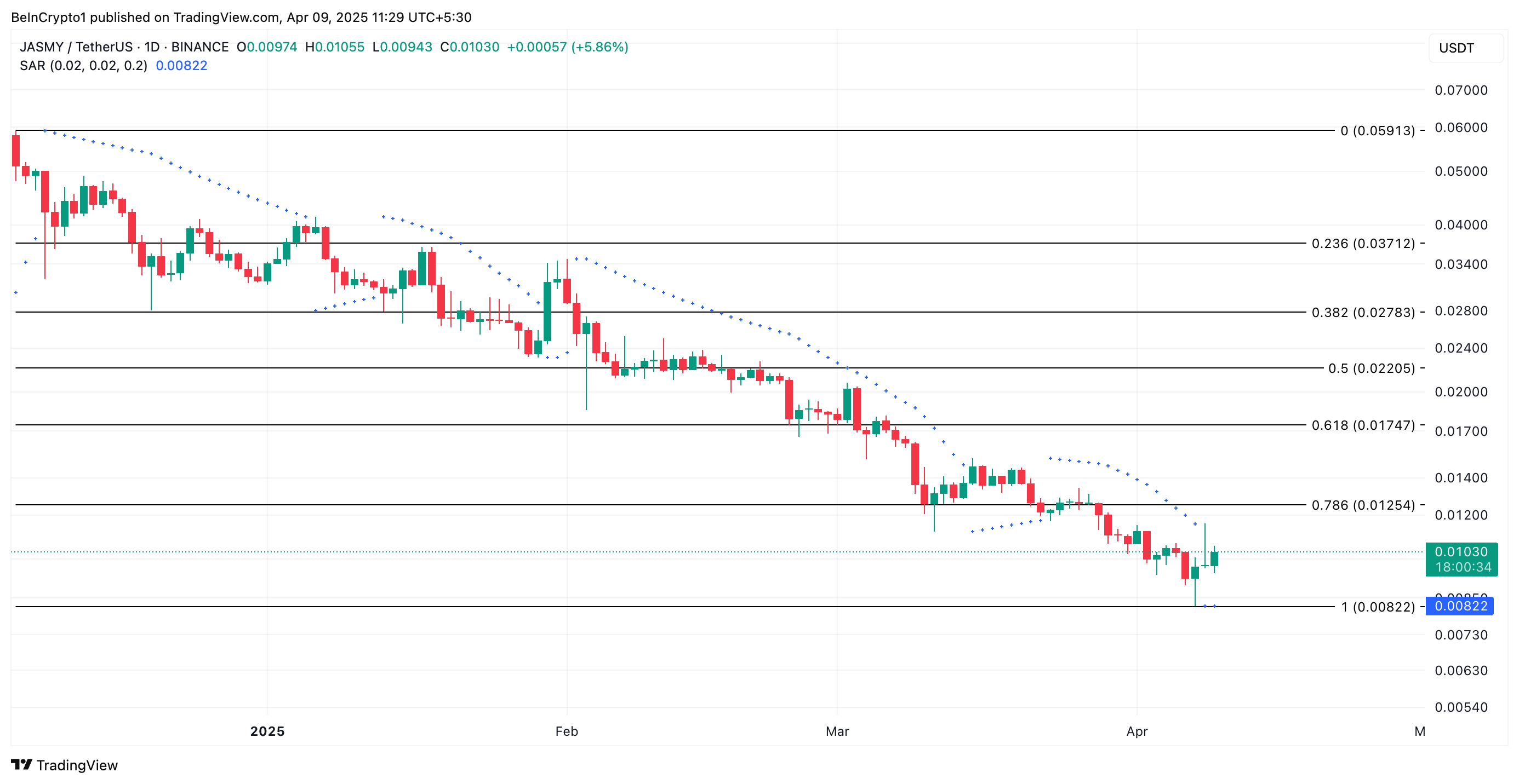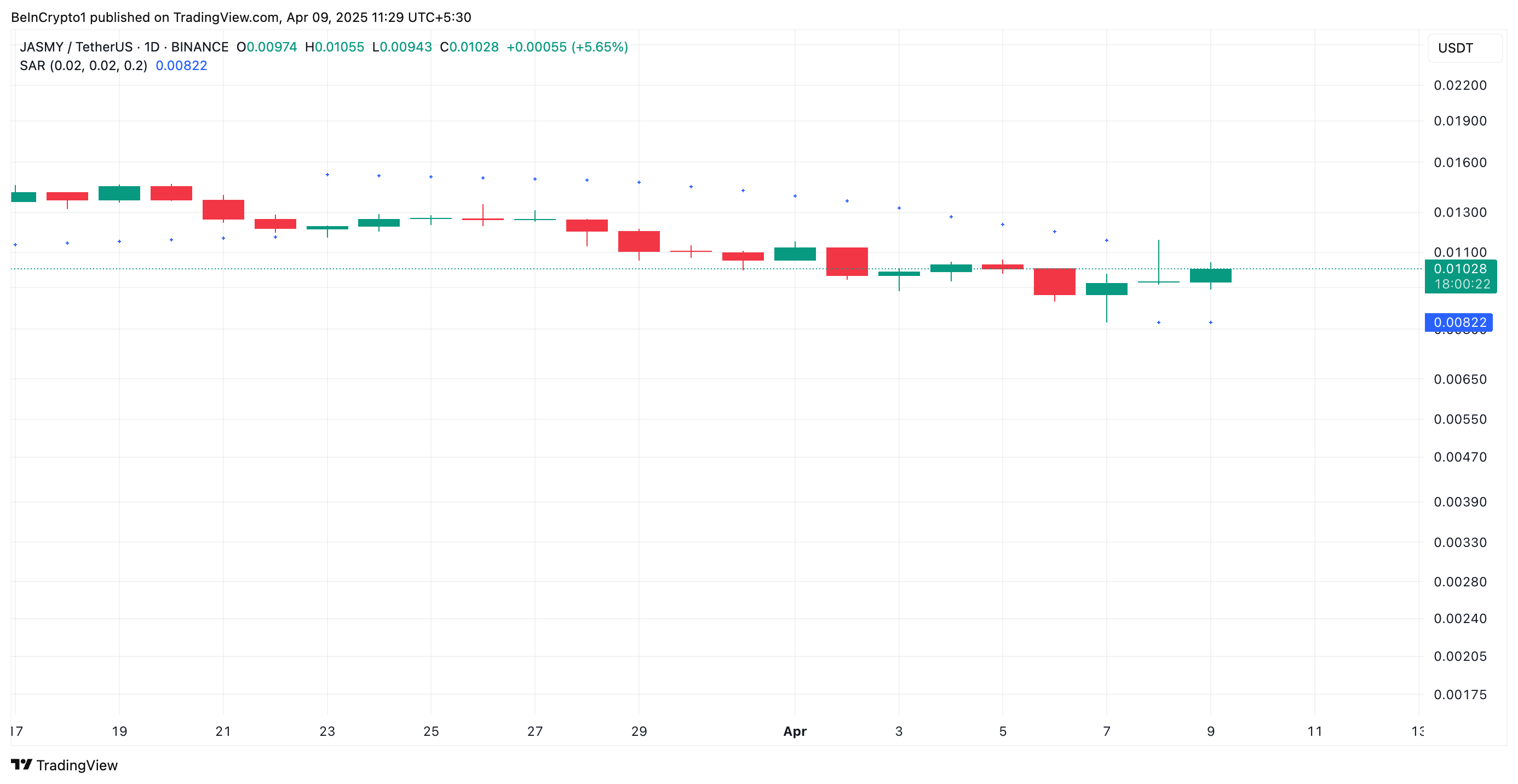 Desuden handler JASMY nu over prikkerne i dens Parabolic Stop and Reverse (SAR) indikator, hvilket bekræfter det bullish skift i markedets momentum.