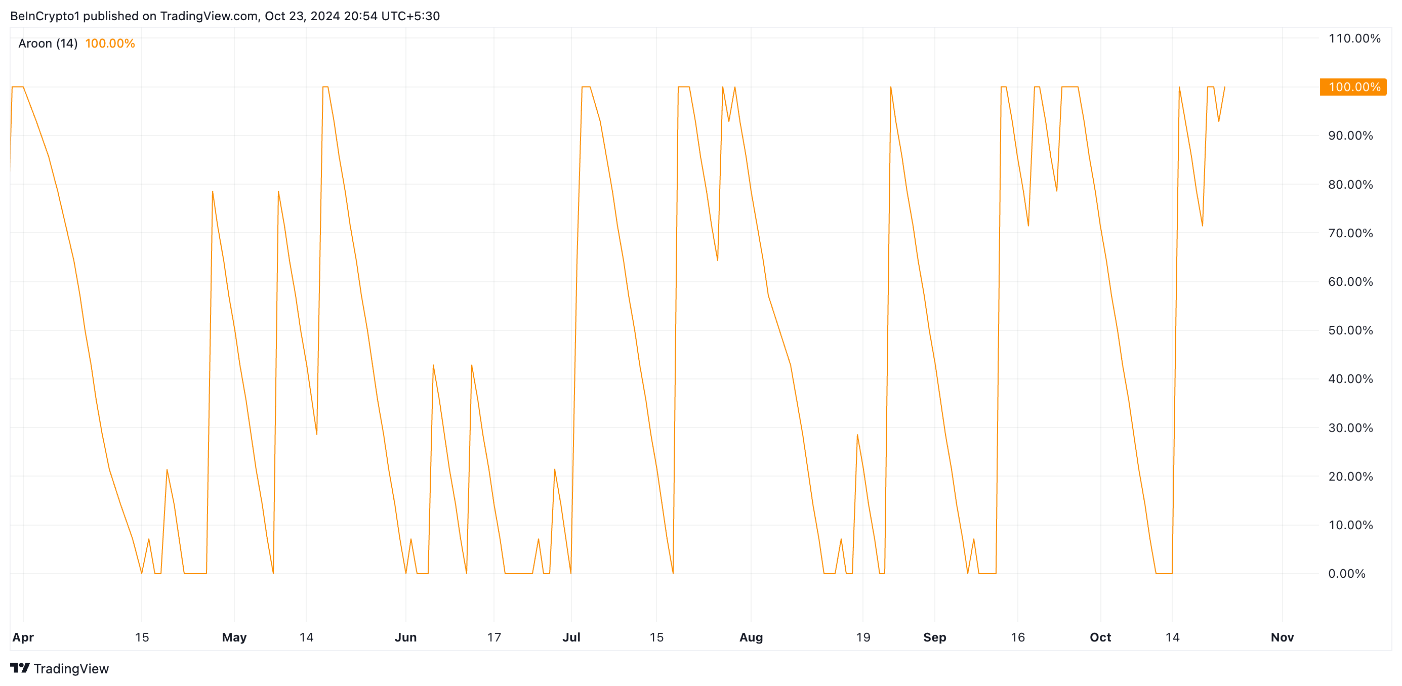 Denne 100% aflæsning er et stærkt bullish signal, der indikerer solid opadgående momentum. Handlere tolker det som en bekræftelse på, at køberne dominerer markedet, hvilket gør yderligere kursstigninger sandsynlige i den nærmeste fremtid.