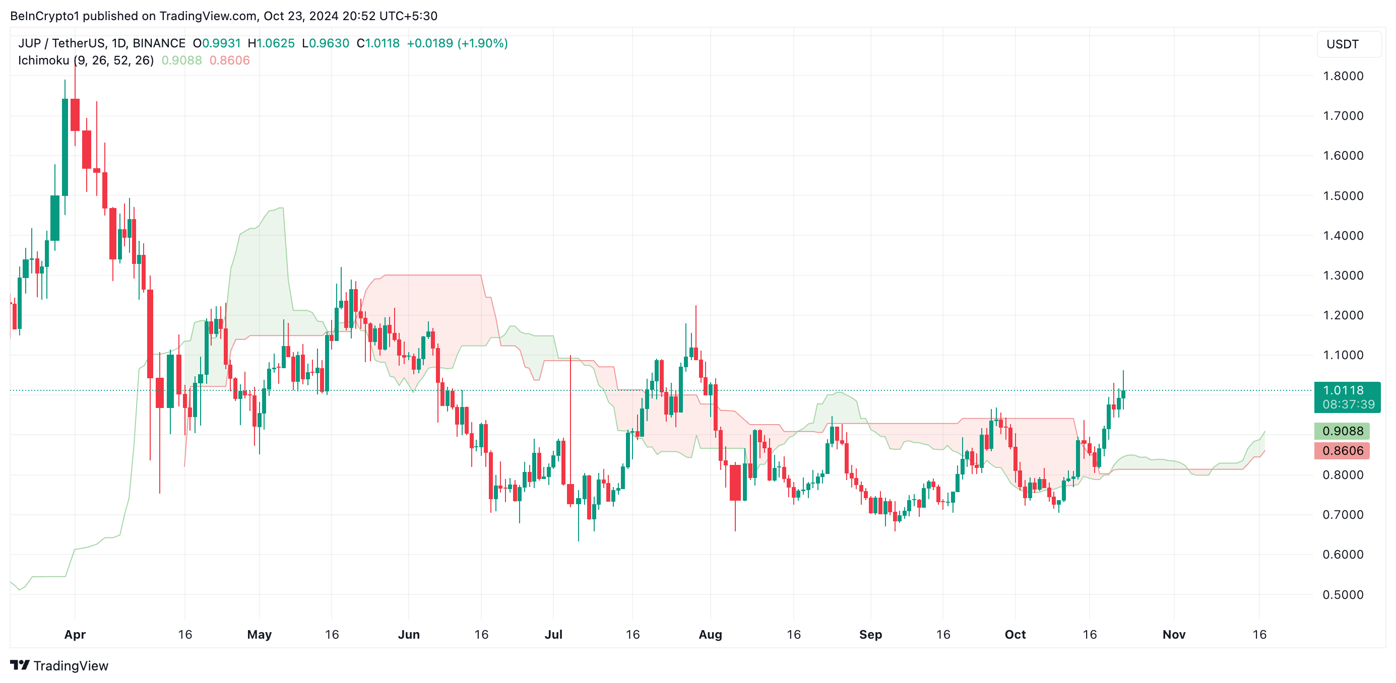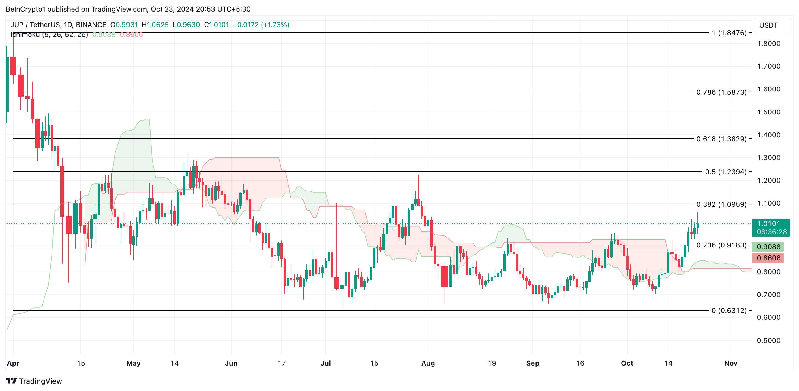 Når en aktivs kurs forbliver over skyen, signalerer det en stærk bullish tendens, hvilket viser, at køberne har kontrol, og at markedsstemningen er positiv. JUPs kurs har været over skyen på det daglige diagram siden den 18. oktober, hvilket indikerer potentielle støtteniveauer.