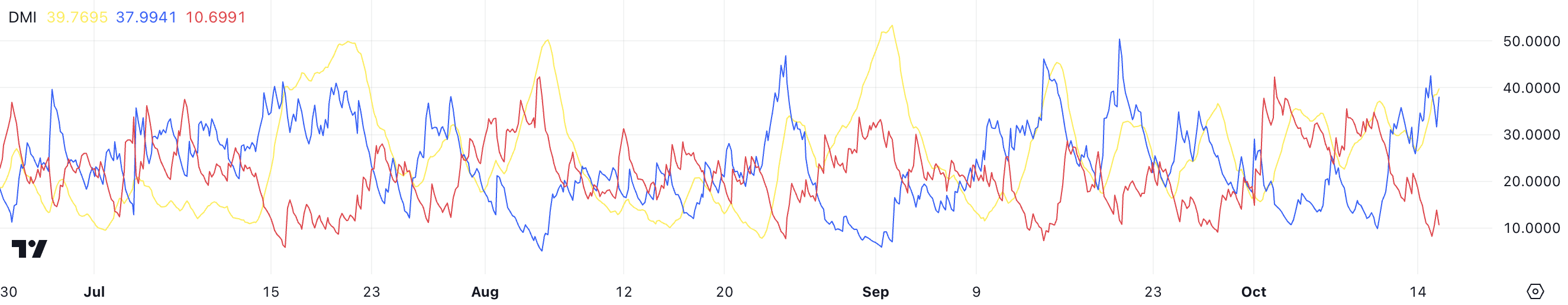 I dette tilfælde indikerer en værdi nær 40 betydelig momentum. Vigtigt er det, at ADX ikke angiver retningen af trenden – den viser blot, hvor stærk den er.