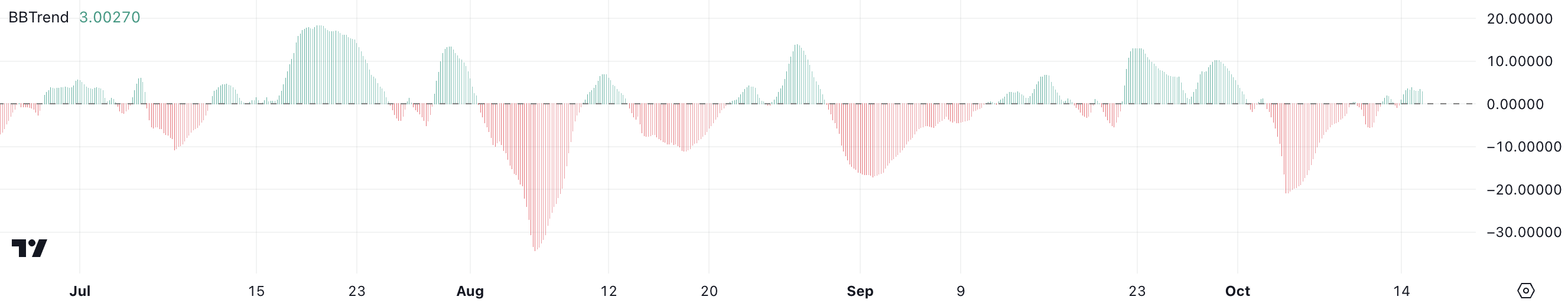 Dette fald antyder, at selvom den nuværende prisbevægelse er positiv, kan den mangle intensiteten set under det tidligere opsving. Kontrasten mellem den nuværende BBTrend-værdi og toppen i slutningen af september afslører, at momentum er noget aftaget siden den tidligere stigning, hvilket indikerer en potentiel svækkelse i bullish styrke.