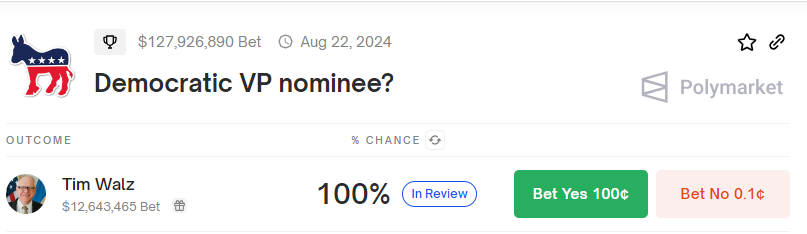 Som BeInCrypto rapporterede, spekulerede mange i, at Mark Kelly fra Arizona, guvernør Josh Shapiro fra Pennsylvania eller senator Gary Peters fra Michigan ville stille op som vicepræsident i Harris’ kampagne. I en overraskende vending valgte Harris en løbemakker, der er imod krypto. Forudsigelsesplatformen Polymarket bekræfter valget.