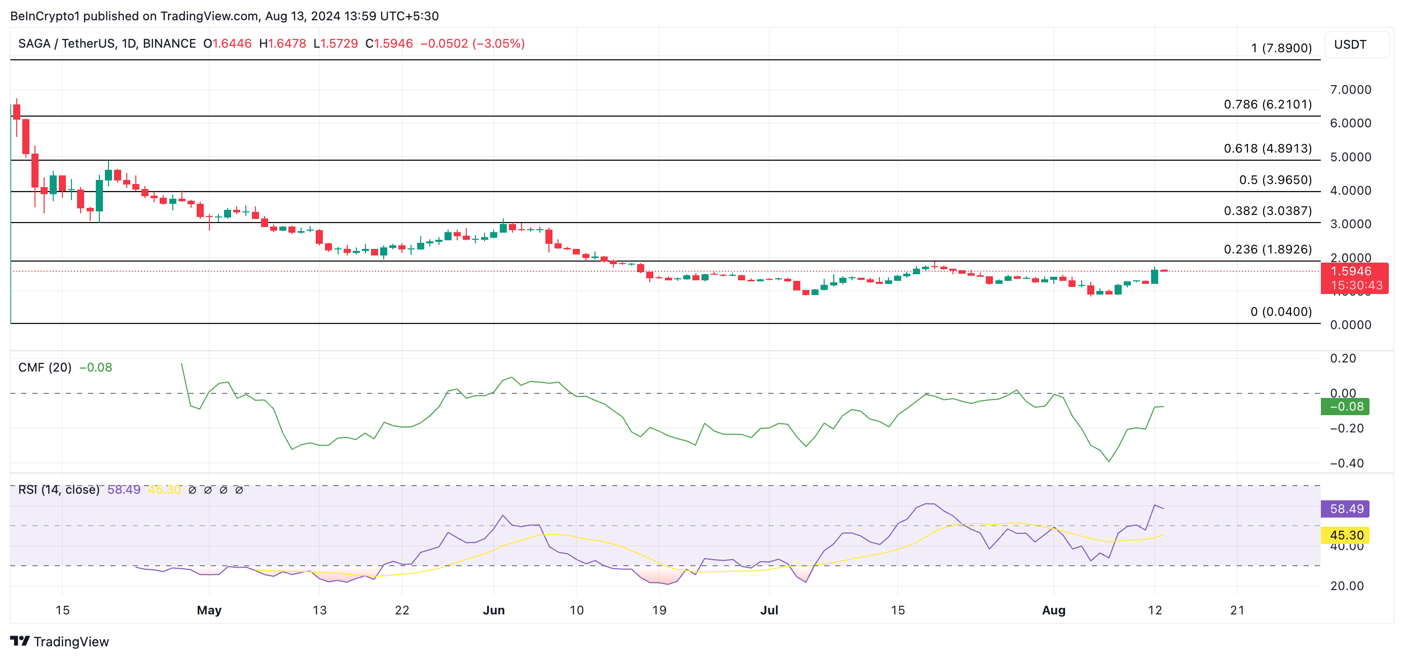 I øjeblikket handles SAGA til $1.60. Under tirsdagens handelssession steg altcoinen til et syv-dages højdepunkt på $1.70, før den oplevede en prisrettelse på 5%.