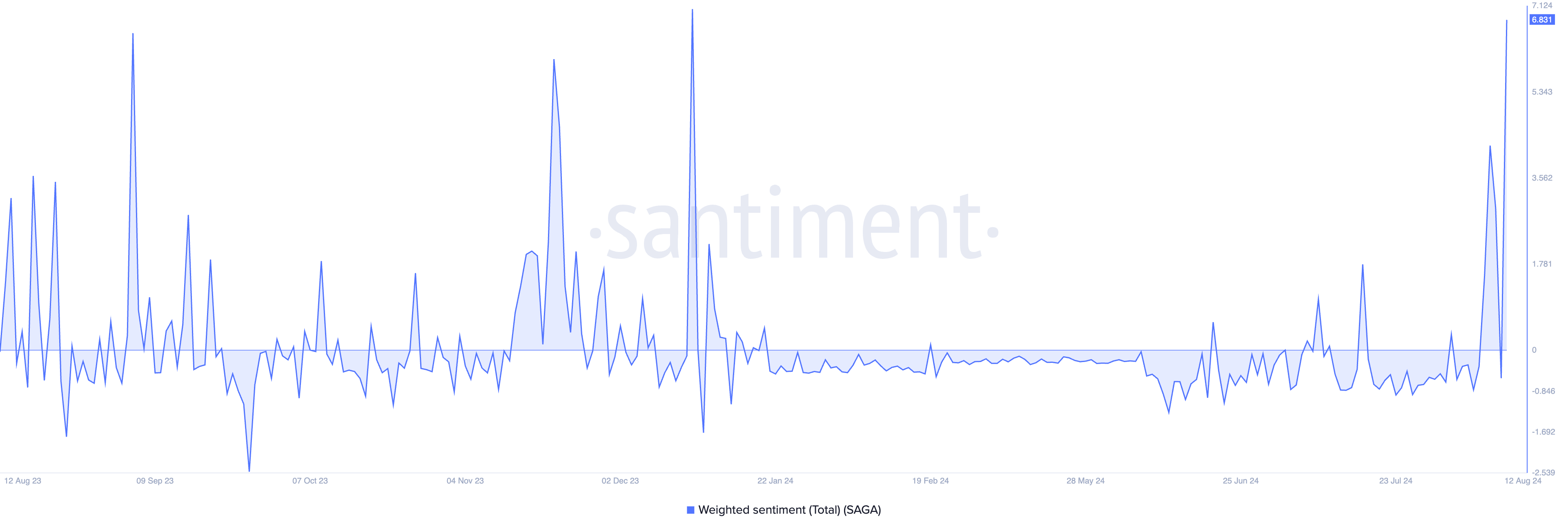 Stigningen i SAGAs handelsaktivitet over de seneste 24 timer skyldes en stigning i positive stemninger blandt handlende i denne periode. I øjeblikket er SAGAs vægtede stemning 6.83, hvilket er det højeste siden 15. december 2023.