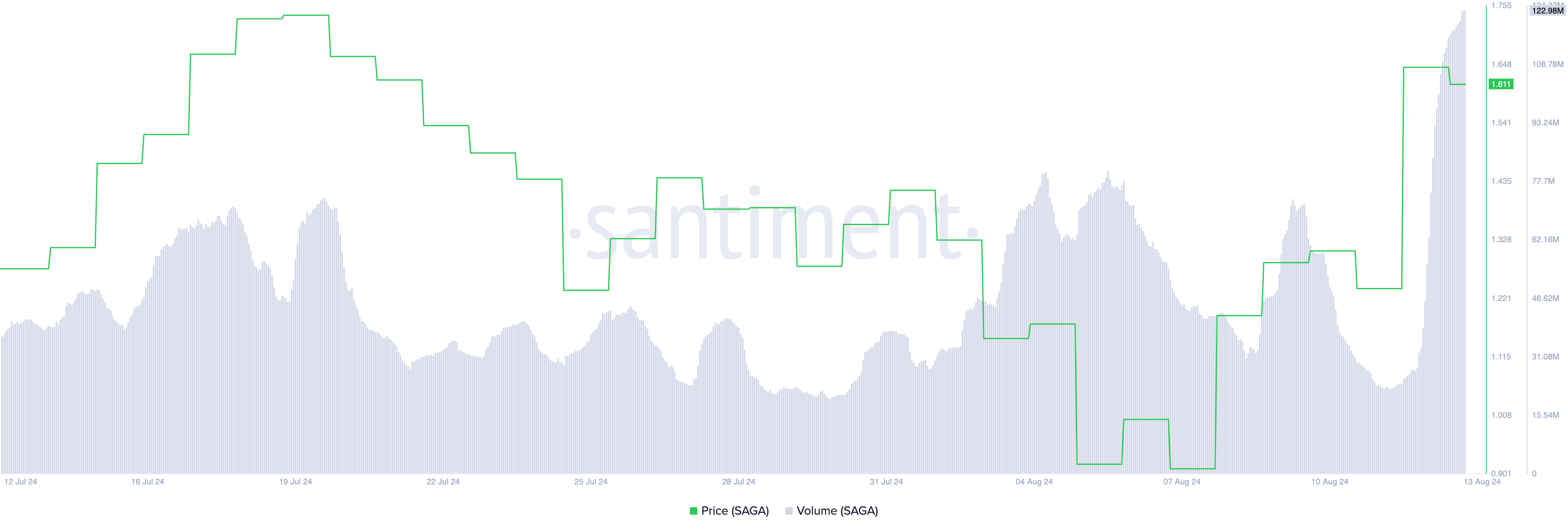 I de seneste 24 timer har SAGAs handelsvolumen nået $123 millioner, hvilket repræsenterer altcoinens højeste enkeltdags handelsvolumen siden 9. juli.