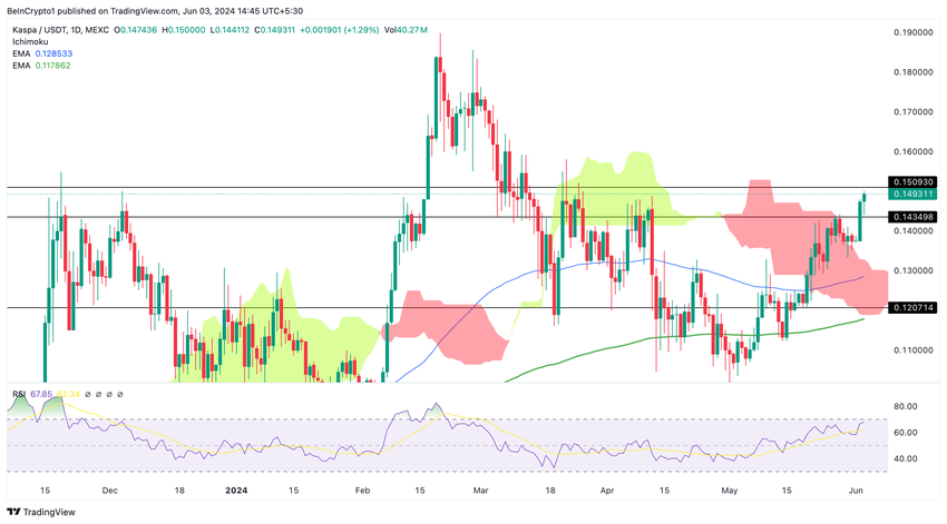 For at udnytte Kaspas bullish udsigter skal du overvåge det vigtigste modstandsniveau på $0,150 og udnytte Ichimoku-skyens signaler. Ophold over skyen, på både 4-timers og daglige diagrammer, antyder fortsat opadgående momentum.