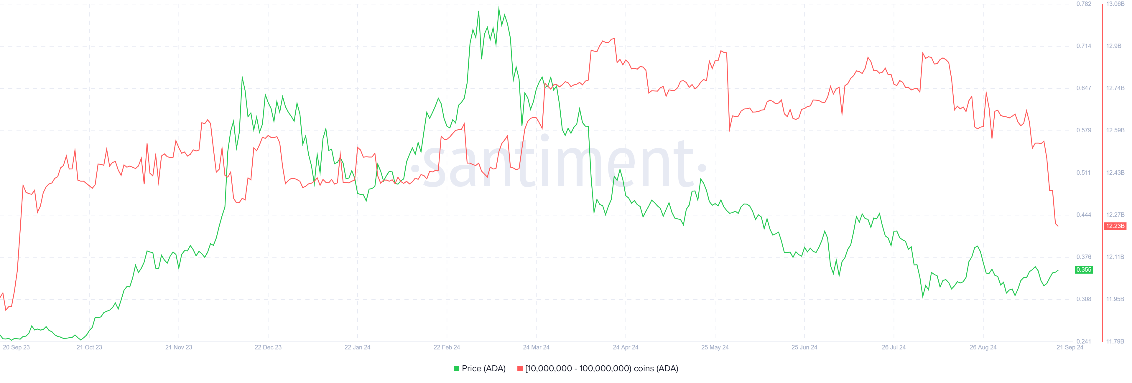 Normalt set som nøglespillere på markedet, er hvalerne blevet pessimistiske omkring Cardanos prisudsigter. Adresser, der holder mellem 10 millioner og 100 millioner ADA, har solgt mere end 320 millioner ADA de sidste fem dage.