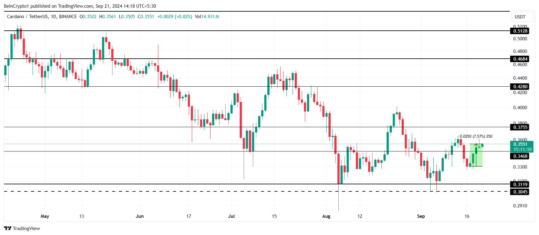 Cardanos kurs er for nylig steget med 7,5%, og handles nu til $0,35. ADA er nu kun 7% væk fra den afgørende $0,37 modstand, som har fungeret som et loft siden nedturen i slutningen af juli. At bryde igennem dette niveau ville være afgørende for ADA for at komme sig over sine seneste tab.