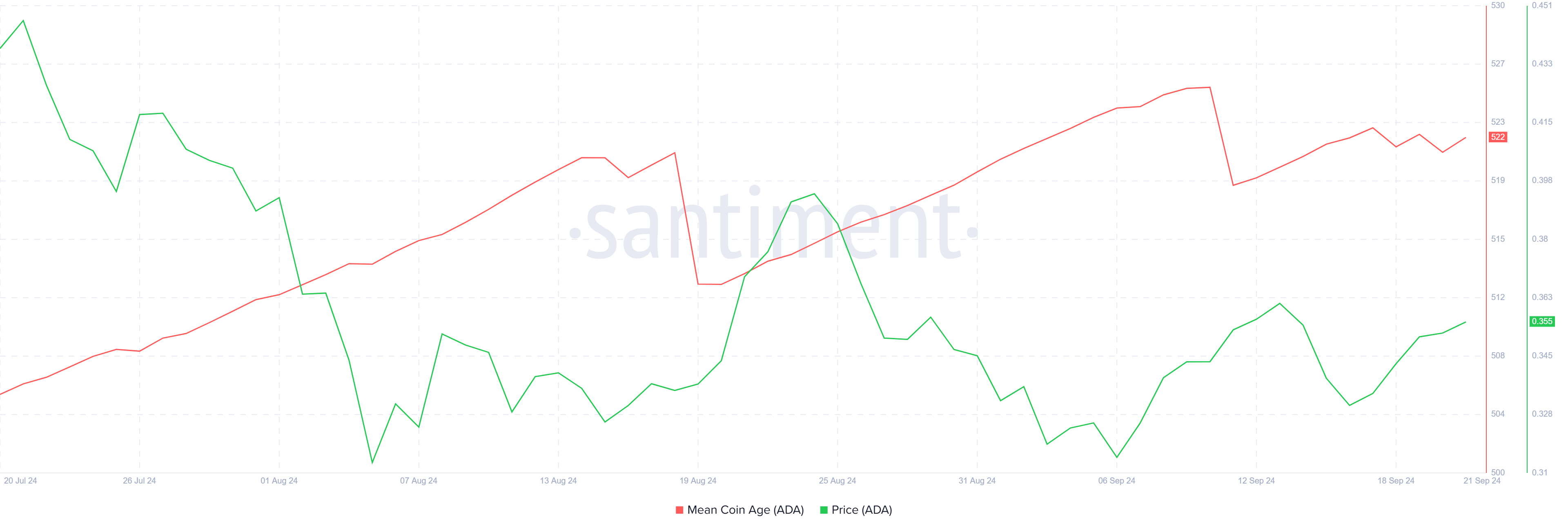 Cardanos makromomentum synes også at afspejle et faldende optimisme blandt langsigtede holdere. Målingen Mean Coin Age, som sporer den gennemsnitlige alder af coins på blockchainen, har ikke formået at vise en konsekvent stigning. En stigende Mean Coin Age ses typisk som et tegn på tillid, idet det indikerer, at langsigtede holdere beholder deres aktiver i stedet for at flytte eller sælge dem.
