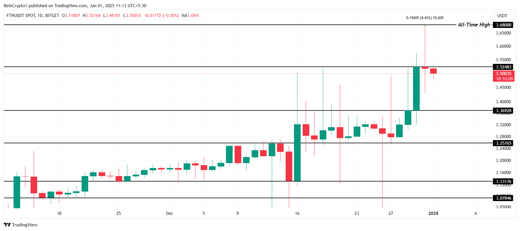 FTN oplevede en 4% intra-dag høj i de sidste 24 timer, nåede $3.68 for at sætte en ny all-time high før den trak sig tilbage til $3.50. Denne lette tilbagegang indikerer noget salgspres, men altcoinen forbliver i fokus, mens handlende overvåger dens næste træk.