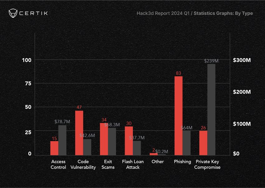 Ifølge CertiK’s “The Web3 Security Quarterly report” løb de ondsindede aktører, alene i januar, af med 193,1 millioner dollars fordelt over 78 hændelser. Februar og marts var ikke langt bagefter med tab på henholdsvis 160,4 millioner dollars og 149 millioner dollars, fordelt på adskillige sikkerhedsbrud.