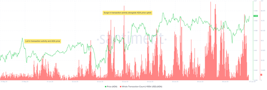 Santiment-data viser en stigning i transaktioner over 100.000 dollars på Cardano-netværket, mens hvaler køber ADA under 0,5 dollars. Diagrammet nedenfor viser en stilstand i transaktionerne mod slutningen af maj, hvor der blev registreret omkring fem før stigningen i juni. Dermed er ADA-prisen steget med 6 % siden 31. maj.