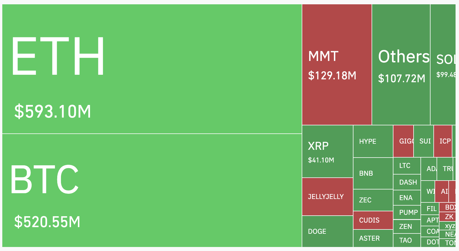 Af det samlede beløb kom ca. 1,38 milliarder dollars fra lange positioner. Den største enkeltlikvidering skete på Hyperliquid, hvor en ETH-USD position til en værdi af 26,06 millioner dollars blev lukket.