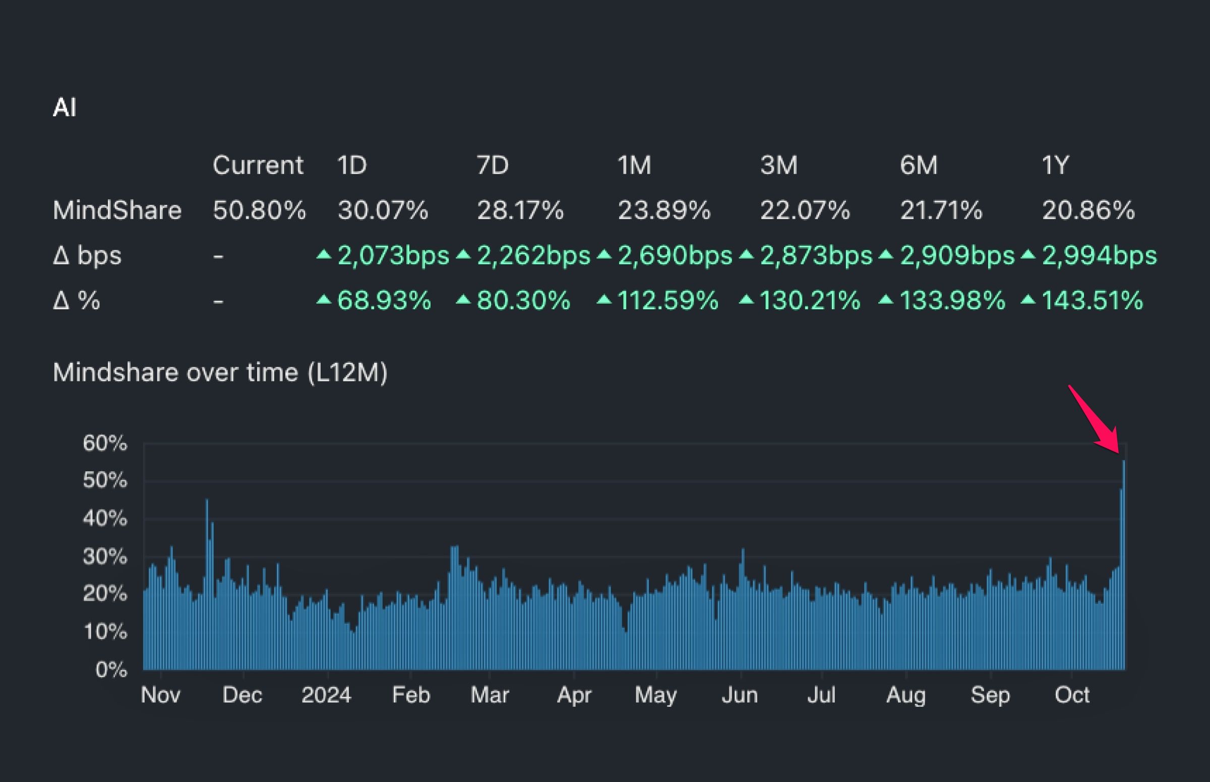 Data fra Kaito viser, at AI diskussioner nåede et nyt højdepunkt i oktober, med en andel på over 50%. Denne måling sporer niveauet af fællesskabsdiskussioner om et specifikt emne, og jo højere procentdel, desto større er investorinteressen.