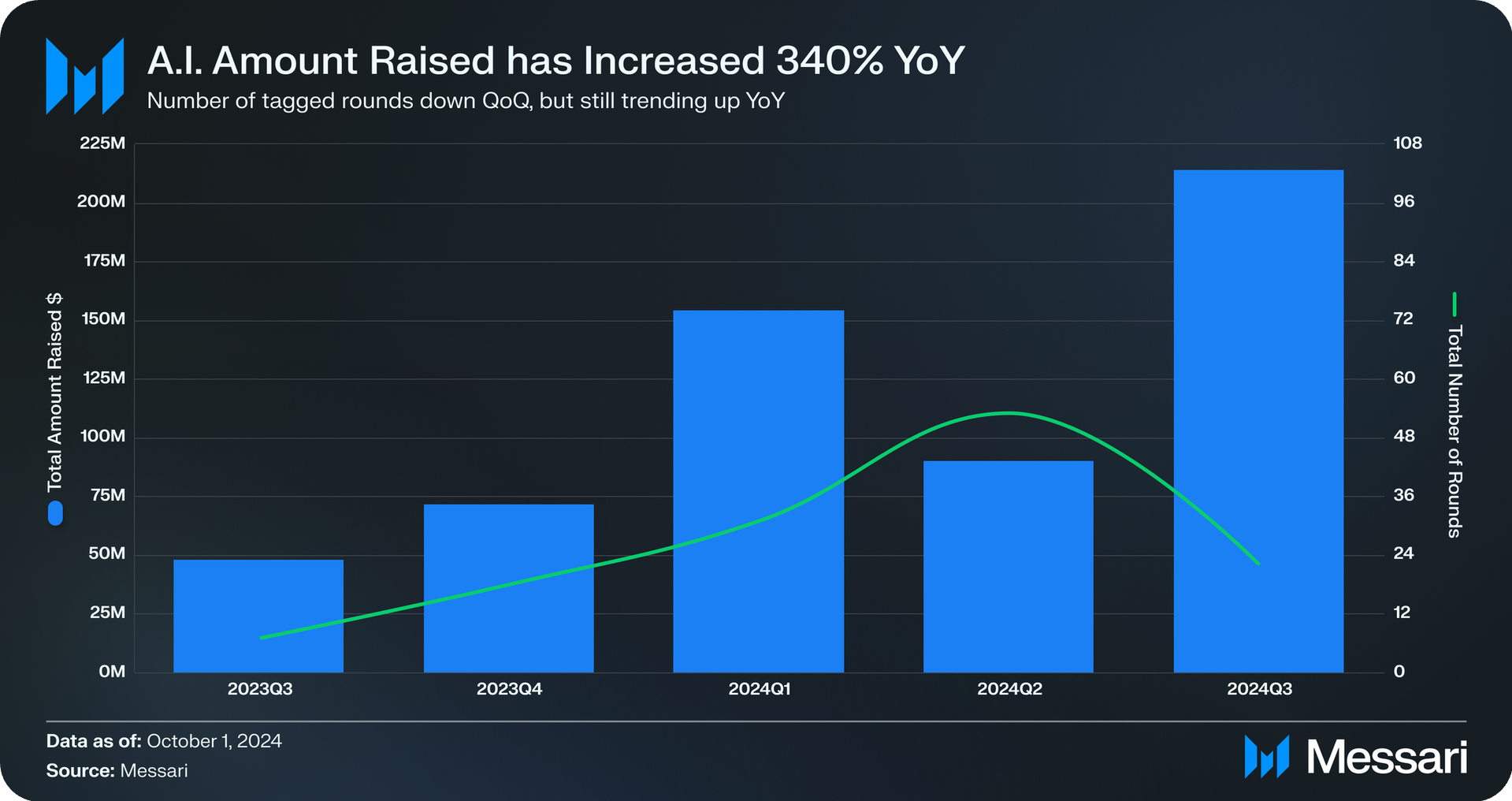 En nylig rapport fra Messari afslørede, at VC’er har investeret over 213 millioner dollars i AI-relaterede projekter sidste kvartal. Det tal markerer en stigning på 340% år-for-år og en 2,5 gange stigning fra Q2.