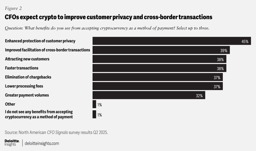 Stablecoins’ tiltrækningskraft involverer primært deres evne til at forbedre kundernes privatliv og lette globale transaktioner. Omkring 45% af CFO’erne ser privatlivsforbedringer som den største fordel. Cirka 39% ser stablecoins som et middel til at strømline internationale betalinger, hvilket potentielt reducerer transaktionsomkostninger og behandlingstider.