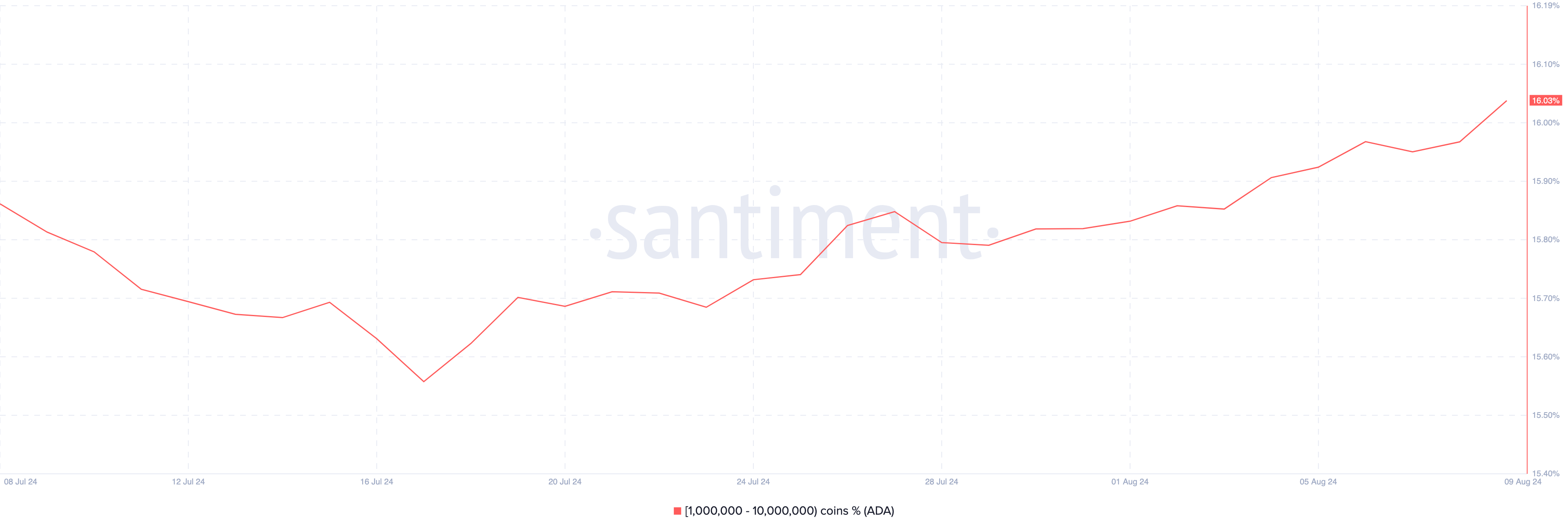 Men, kryptohvaler ser tilsyneladende det nylige fald som en mulighed for at købe på faldet. Baseret på data fra Santiment er saldoen for adresser, der holder mellem 1 million og 10 millioner tokens, steget og udgør nu over 16% af det samlede ADA-udbud.