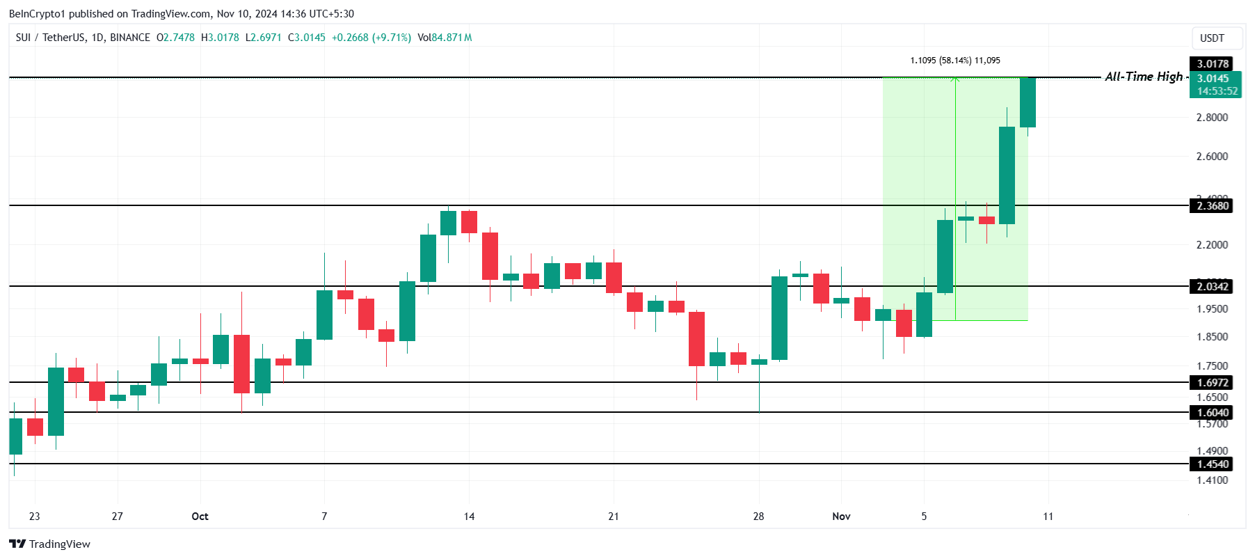 SUI er steget med 58% denne uge og nåede et nyt historisk højt niveau på $3.01, drevet af optimistiske signaler fra det bredere marked og Bitcoins opsving. Denne imponerende vækst fremhæver SUIs nuværende momentum og investorinteresse, da altcoinen udnytter gunstige markedsforhold.