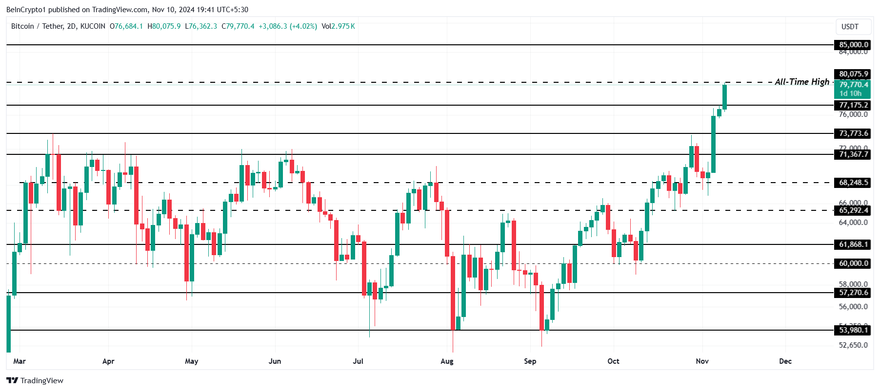Bitcoins kurs er steget med 4% i de seneste 24 timer og nåede et nyt historisk højt niveau på $80,075 under dagens handel. Den førende kryptovaluta er nu tæt på at krydse den betydelige grænse på $85,000, hvilket fanger markedets spænding og interesse.