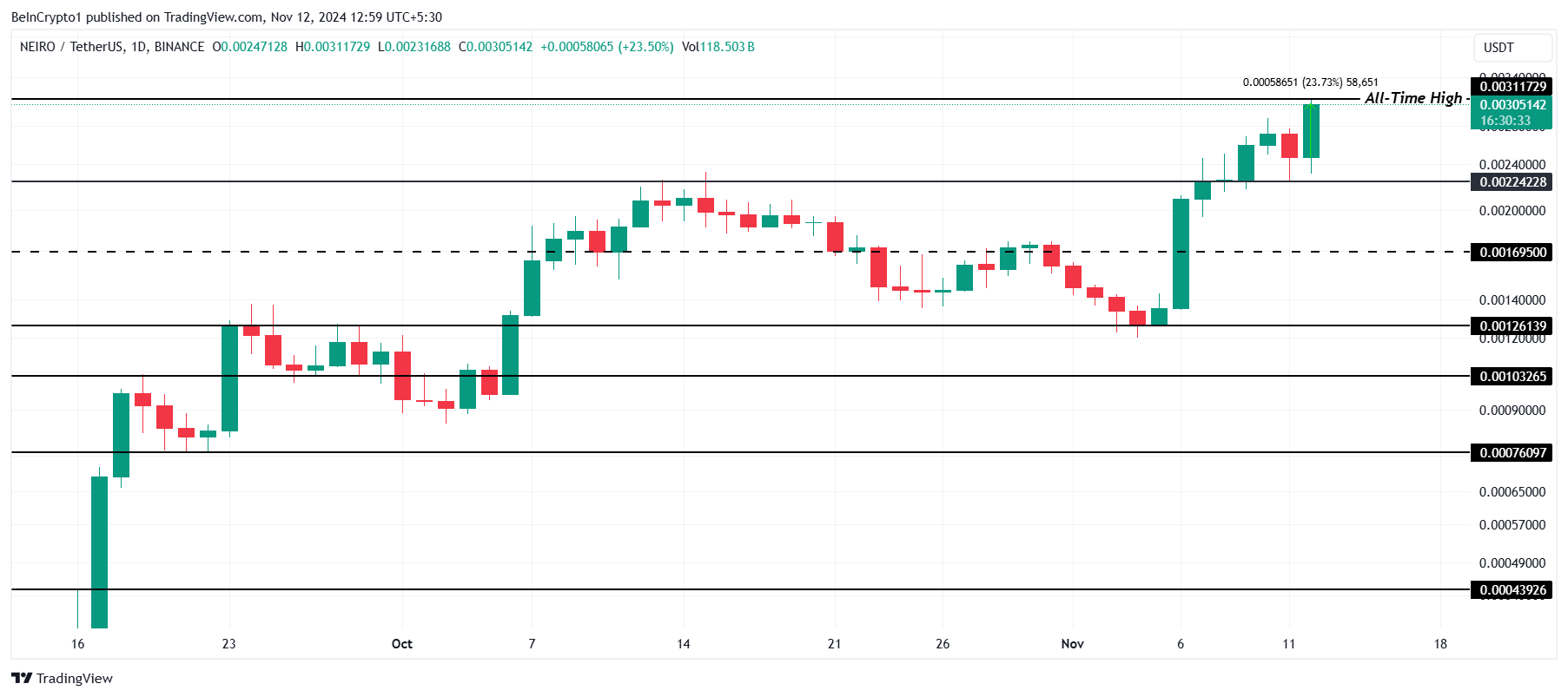 NEIRO nåede i dag en ny all-time high på $0.0031, hvilket markerer en stigning på 23%. Det er den femte ATH registreret af meme coinen i den seneste uge, hvilket fremhæver dens fortsatte momentum og appel blandt investorer.
