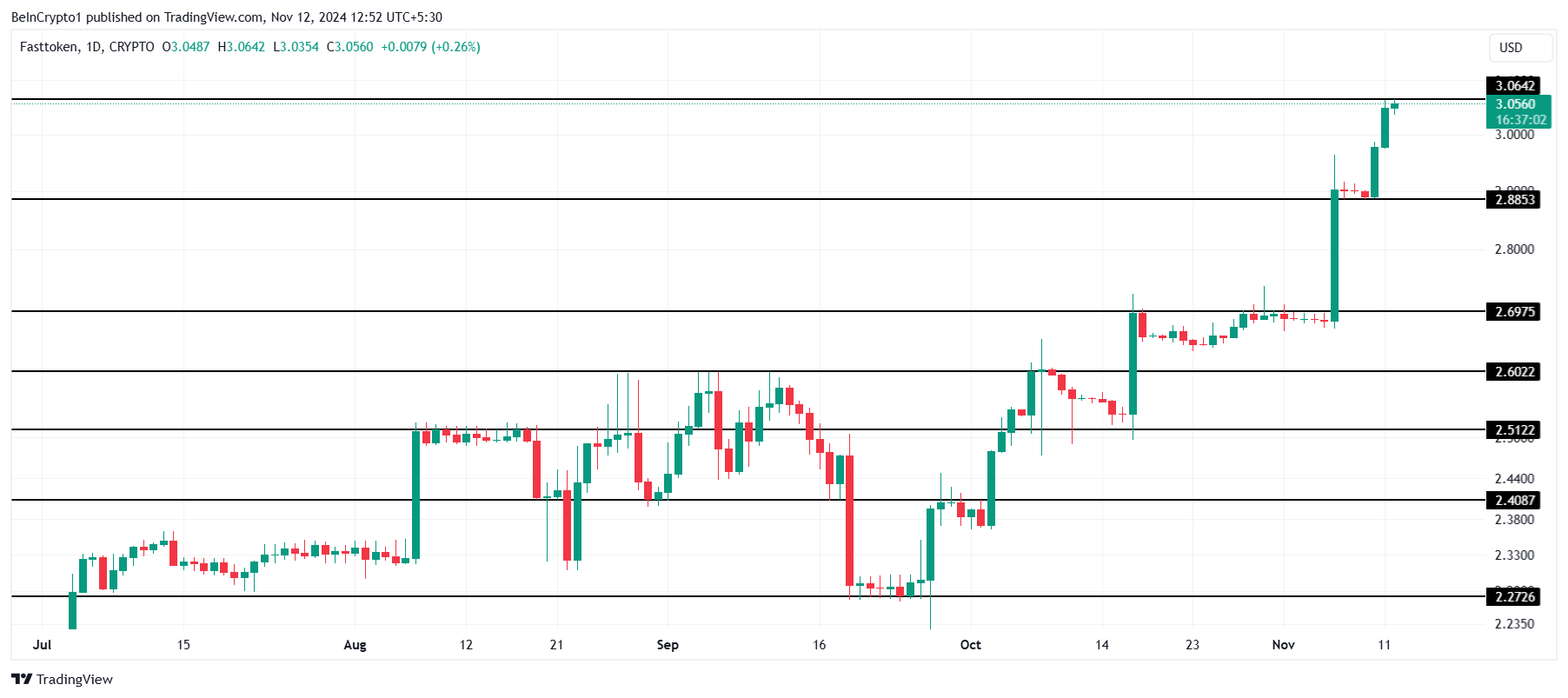 Fasttoken nåede en ny all-time high på $3.06 på trods af en beskeden stigning på 3% i de sidste 24 timer. Denne gevinst blev understøttet af et stærkt fundament, hvor FTN etablerede en støttebund på $2.88 for at fremme sit seneste opadgående træk.