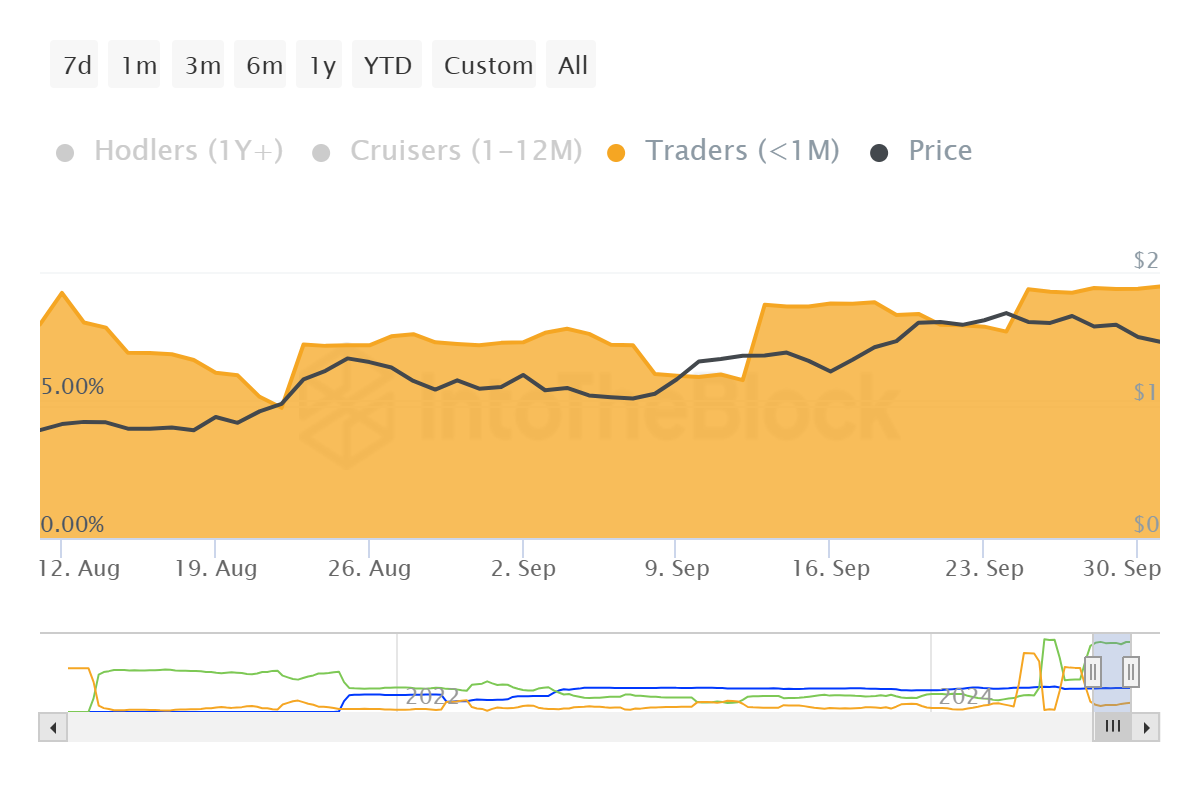 Stigningen i kortfristede indehavere på ASI-netværket er blevet en voksende bekymring. Disse investorer, som typisk holder FET i mindre end en måned, kontrollerer nu over 9% af kryptovalutaens cirkulerende udbud fra 5,6% sidste måned. Selvom kortfristede indehavere ikke dominerer markedet i øjeblikket, kan deres stigende tilstedeværelse varsle problemer for FET, hvis de beslutter at realisere overskud hurtigt.
