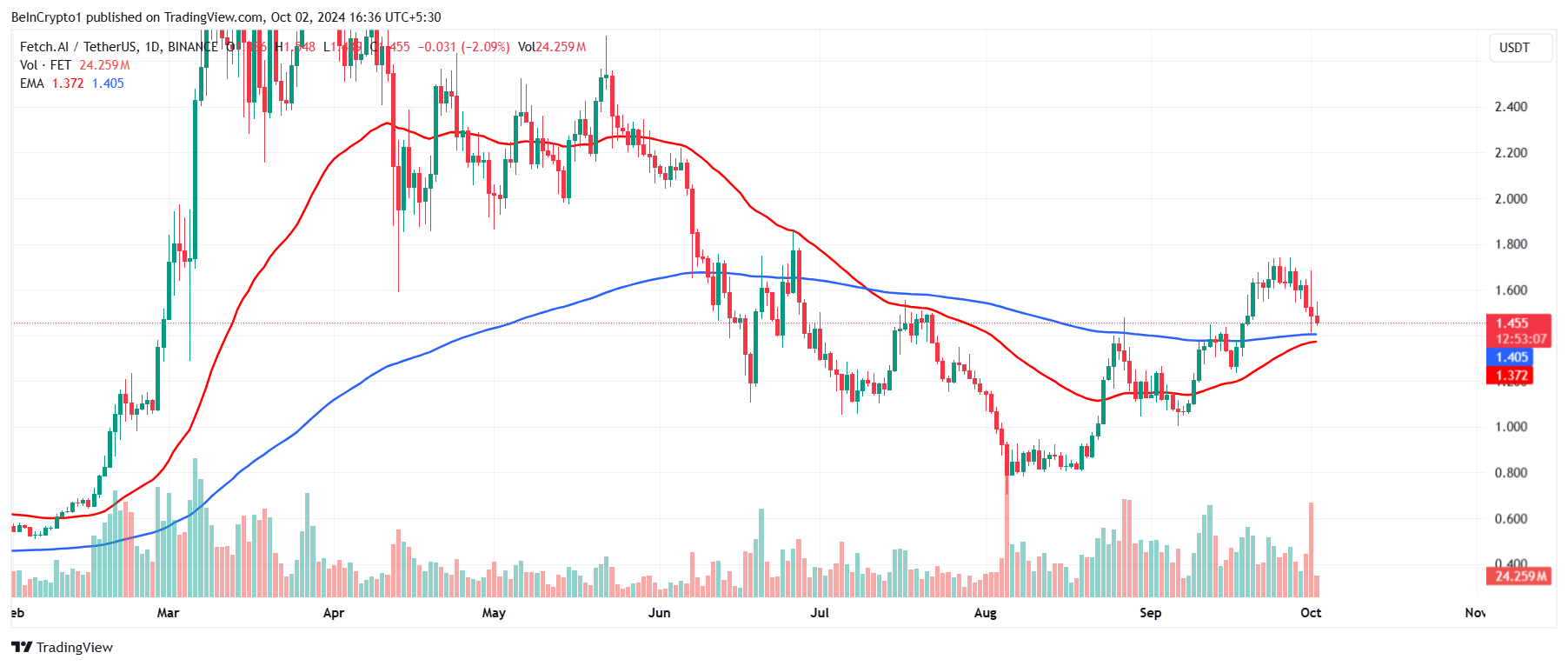 Fra et teknisk perspektiv viser ASI-tokenet tegn på at opbygge optimistisk momentum. De 50-dages og 200-dages eksponentielle glidende gennemsnit (EMA’er) er på nippet til at danne et Golden Cross, en optimistisk indikator, der kunne signalere afslutningen på det nuværende Death Cross, som har været aktivt siden midten af juli. Denne potentielle ændring vil sandsynligvis genoplive markedstilliden til FET og skabe grundlag for yderligere kursvækst.