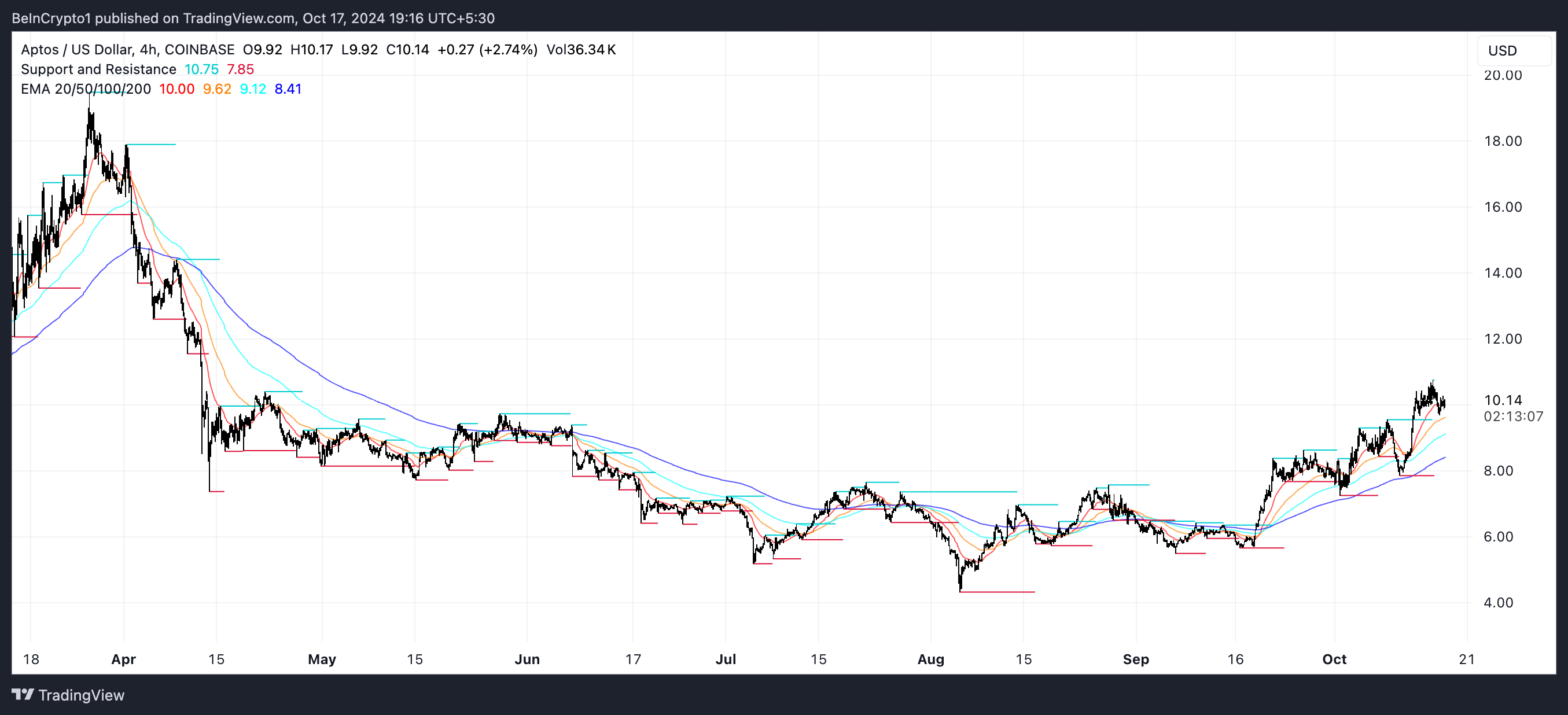 APT’s EMA-linjer er i øjeblikket bullish, med kortsigtede linjer placeret over langsigtede. Dog er afstanden mellem disse linjer betydeligt indsnævret, hvilket indikerer, at det bullish momentum måske svækkes. Når afstanden mellem kortsigtede og langsigtede EMA’er mindskes, signalerer det ofte, at trenden kunne være ved at miste styrke og snart kunne vende.
