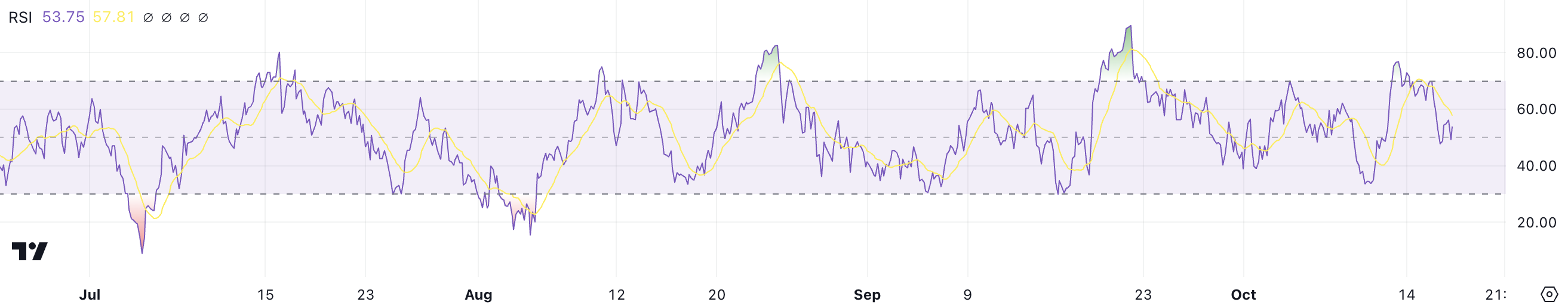 Aptos (APT) RSI er i øjeblikket på 53,75, faldet fra 76 for blot fire dage siden. Dette fald tyder på en reduktion i købspresset sammenlignet med nylige toppe, hvilket signalerer en potentiel afkølingsperiode i markedets aktivitet. Men det nuværende RSI-niveau viser stadig et neutralt til mildt bullish udsyn.