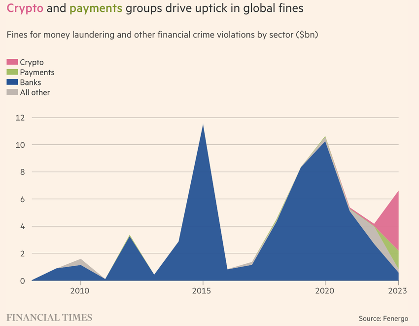Myndighederne har øget deres kontrol med krypto og gjort indgrebet til en del af et globalt initiativ til at regulere det. I 2023 fik digitale betalings- og kryptovirksomheder bøder på i alt næsten 5,8 milliarder dollars for manglende bekæmpelse af hvidvaskning af penge.