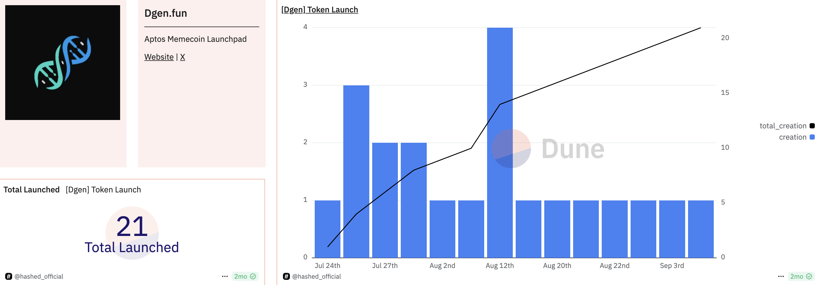 Ifølge Dune Analytics har SunPump kun skabt otte tokens i dag, mens Dgen.fun har genereret 21. Disse tal indikerer, at ingen af platformene endnu kan konkurrere med Raydium LaunchLab eller Pump.funs skala.